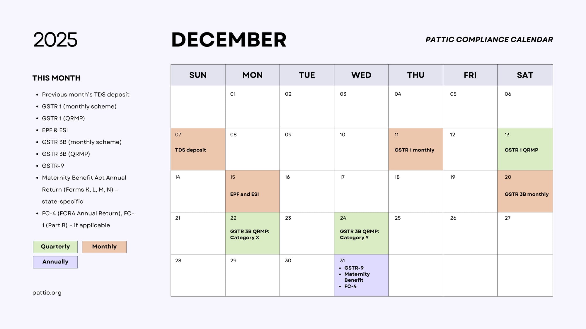 31 December – GSTR-9 – annual GST return for FY 2024-25 - Labour / social security